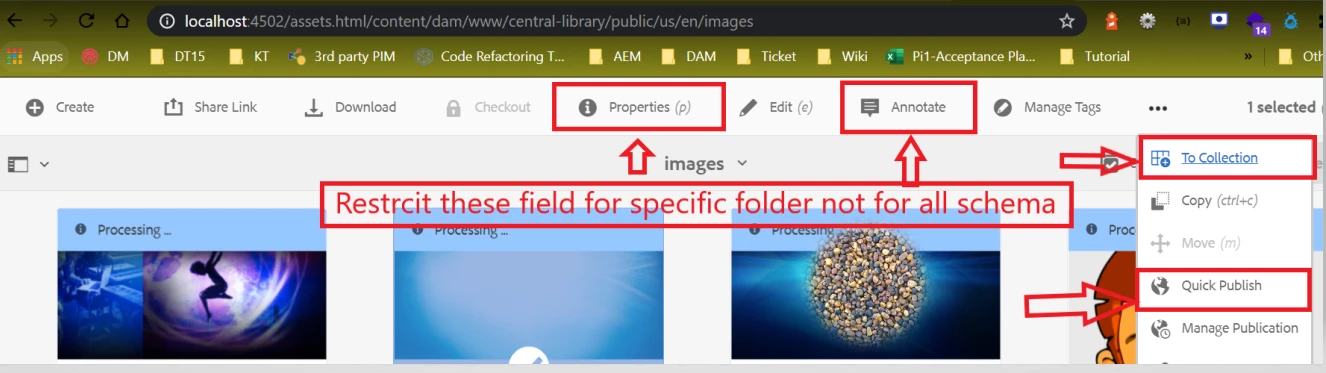 Now, If I open central-library schema folder and I need to restrict "Properties", "To Collection" , "Annotate" , "Quick Publish" from Action Bar only for central-library schema, not for Public folder.