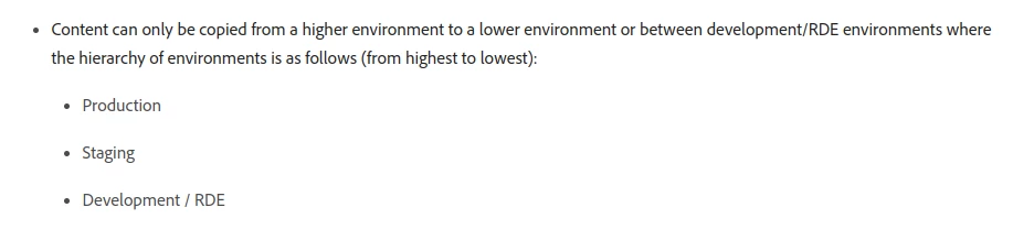 Right, content can only be copied from a higher environment to a lower environment or between development/RDE environments where the hierarchy of environments is as follows (from highest to lowest)