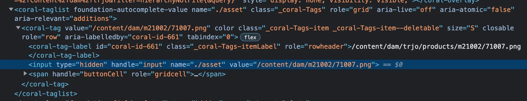 Note : Above code is not working because pathfiled input is not having any value attribute looks like value is getting from coral-tag as shown below.