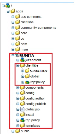 After migrating to AEM 6.4 , I have moved to the clientlibs under the apps/Sunita , as shown below.