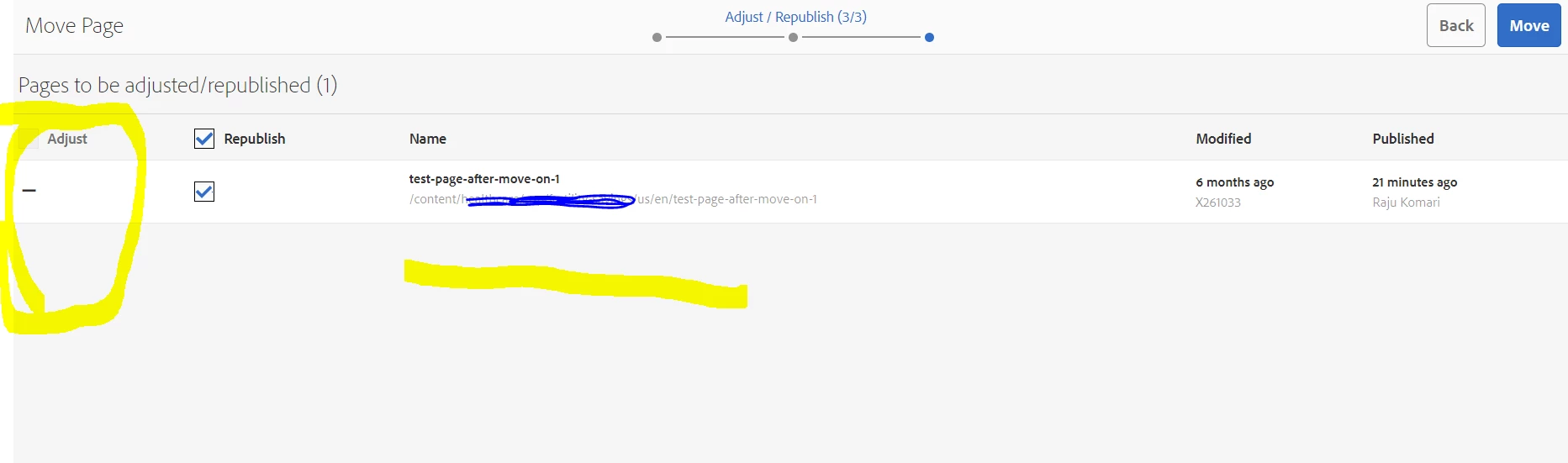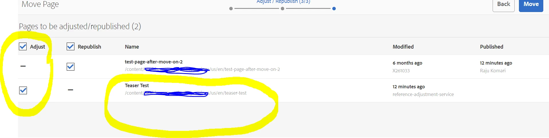 In Development environment, We see reference page count and Adjust option showed up when moving/renaming page like below with highlighted in yellow color, but in qa/higher environment it is not showing and which leads to issue where internal links are not getting updated after page moved/renamed.