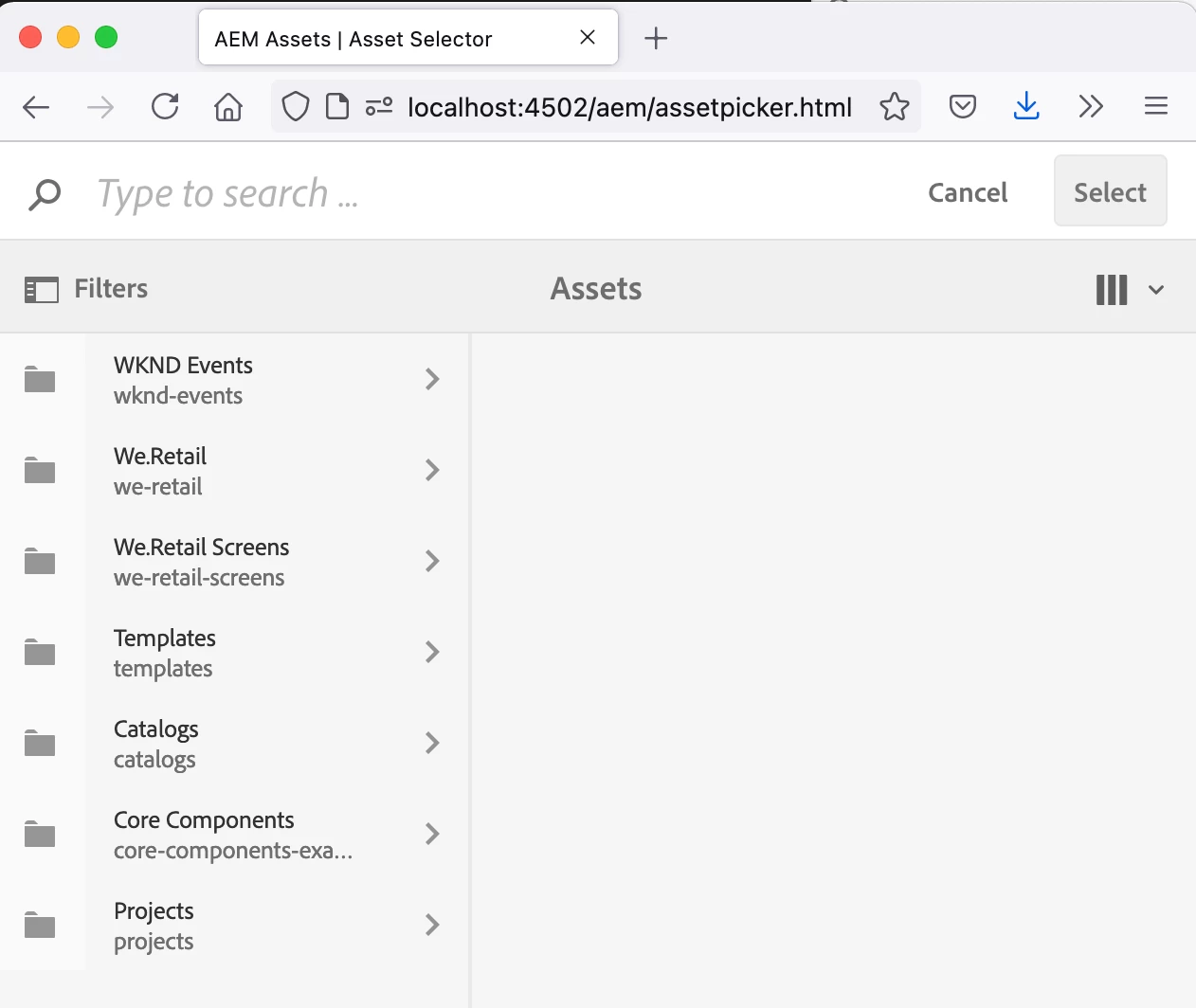 This will bring up the Asset Selector UI. You can also provide parameters to control the dialog (see documentation).