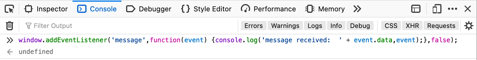 window.addEventListener('message',function(event) {console.log('message received: ' + event.data,event);},false);