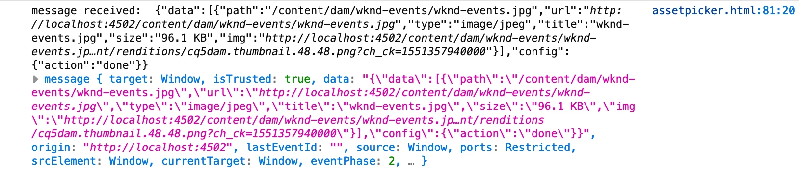 message { target: Window, isTrusted: true, data: "{\"data\":[{\"path\":\"/content/dam/wknd-events/wknd-events.jpg\",\"url\":\"http://localhost:4502/content/dam/wknd-events/wknd-events.jpg\",\"type\":\"image/jpeg\",\"title\":\"wknd-events.jpg\",\"size\":\"96.1 KB\",\"img\":\"http://localhost:4502/content/dam/wknd-events/wknd-events.jp…nt/renditions/cq5dam.thumbnail.48.48.png?ch_ck=1551357940000\"}],\"config\":{\"action\":\"done\"}}", origin: "http://localhost:4502", lastEventId: "", source: Window, ports: Restricted, srcElement: Window, currentTarget: Window, eventPhase: 2, … }