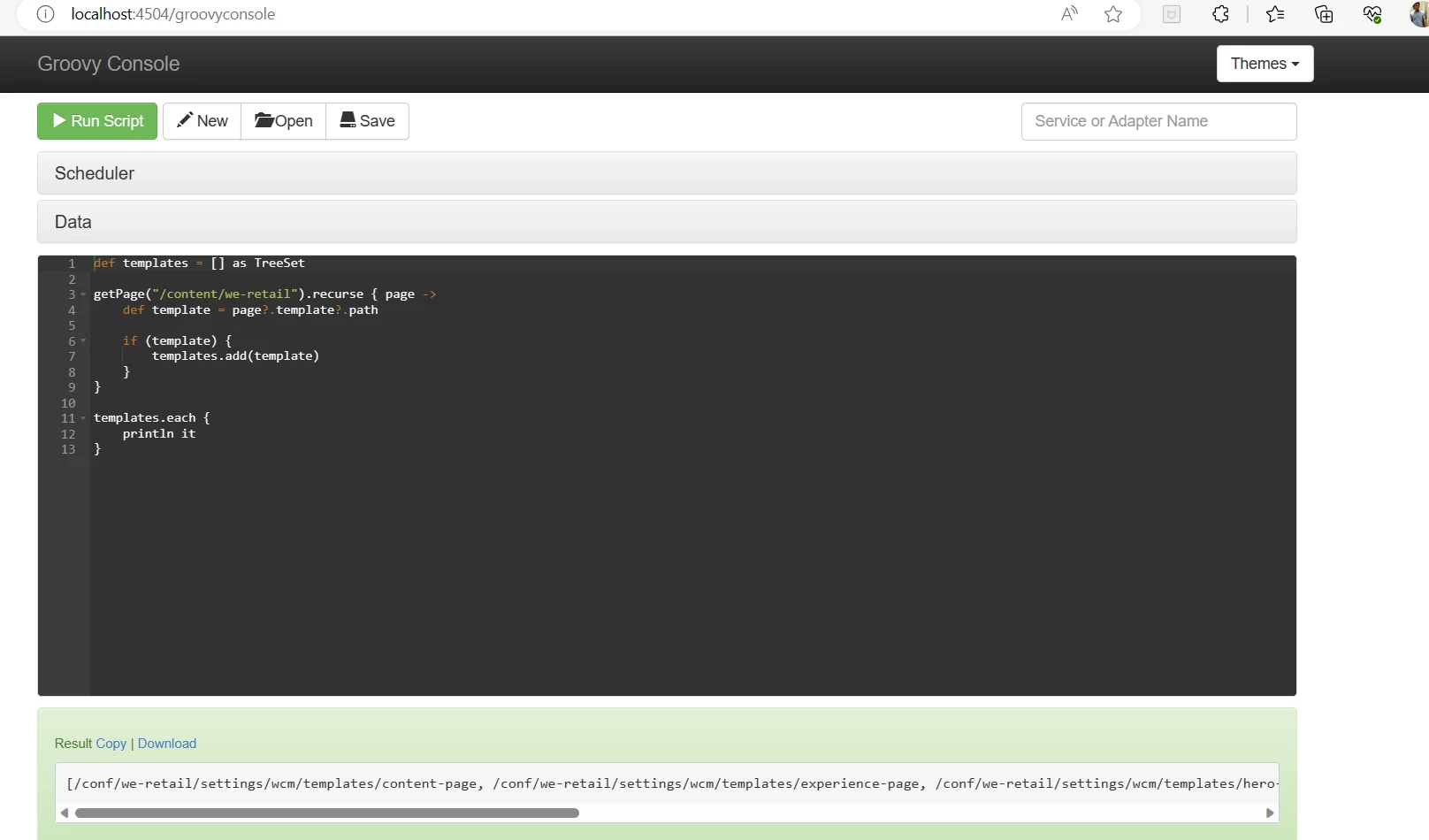Tried to use Groovy console 17.x on AEM 6.5 local instance. But facing some issues while running the script.