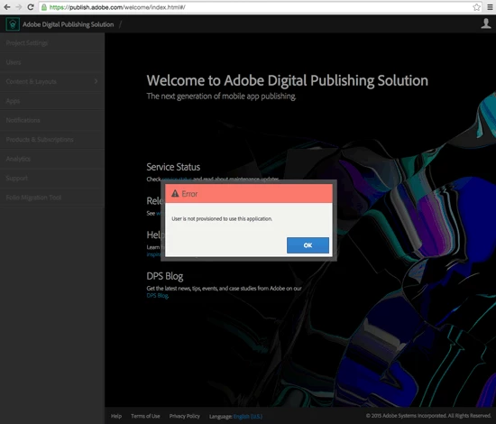 If i try to DPS 2015 login Digital Publishing Solution | Beta Program i see this message: User is not provisioned to use this application