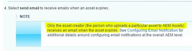 To enable the Assets console to display the referencing compound assets along with the expired subassets, configure an Adobe CQ DAM Expiry Notification workflow in AEM Configuration Manager.