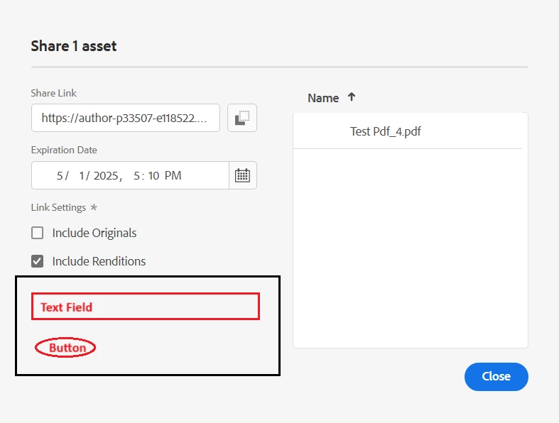 I want to add the text field and a button into the popup. For the same, I am trying to customize the Assets "Share Link" popup by overlaying "/libs/dam/gui/content/assets/adhocassetsharedialog" to "/apps/dam/gui/content/assets/adhocassetsharedialog".