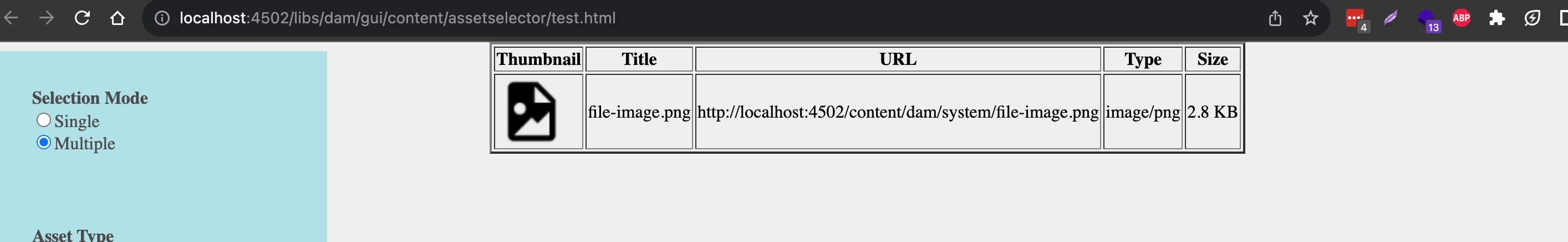 I am trying to build a similar page on my website http://localhost:4502/libs/dam/gui/content/assetselector/test.html which will open the asset selector dialog, and once the user chooses the assets then it will display all the properties of the asset, not just few properties.
