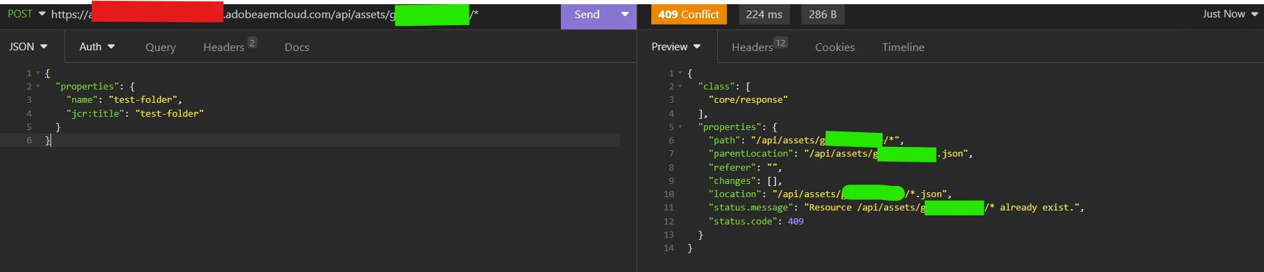 I am attempting to create a new folder in the AEM cloud utilizing the assets/api. This is my payload