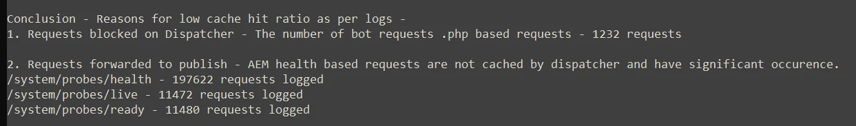We received a BPO Report highlighting Cache Hit Ratio of 80% against Adobe's recommendation of 90%. However, a large number of requests which are received at Dispatcher are not cache able. (Health Check based requests like /system/probes/health, /system/probes/live, /system/probes/ready and Bot Based Requests like GET /3x.php/?3x=3x which are blocked at Dispatcher) |