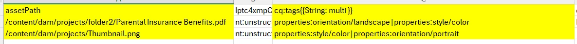 I have an excel sheet list of assets that need tagging which seem was exported as a csv initially. The sheet only includes filenames with the path /content/dam/.../filename.jpg. Tags that need adding are from different locations within the tag hierarchy.