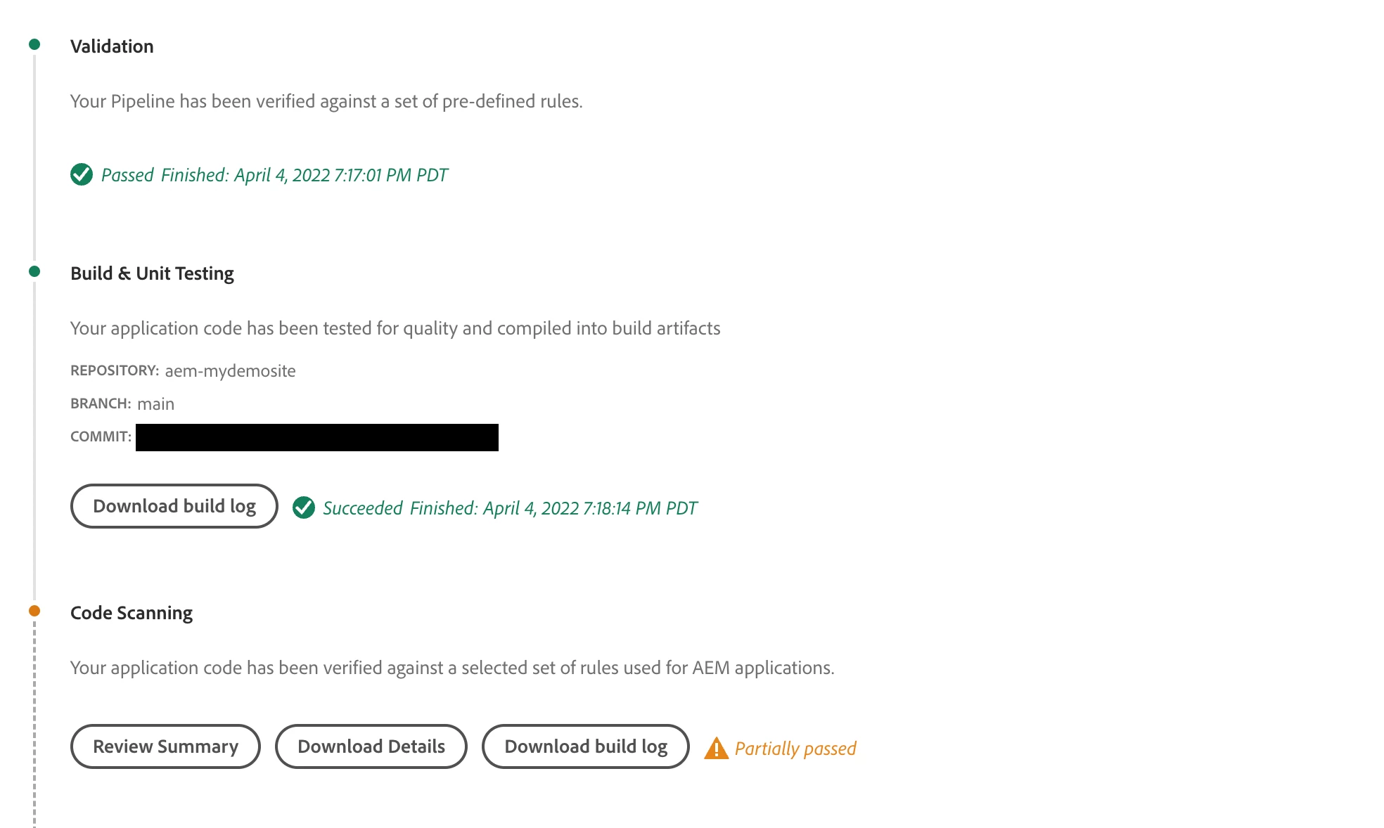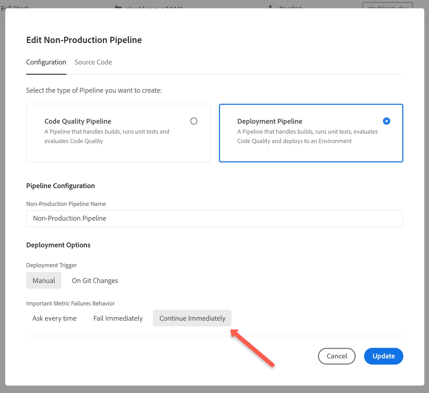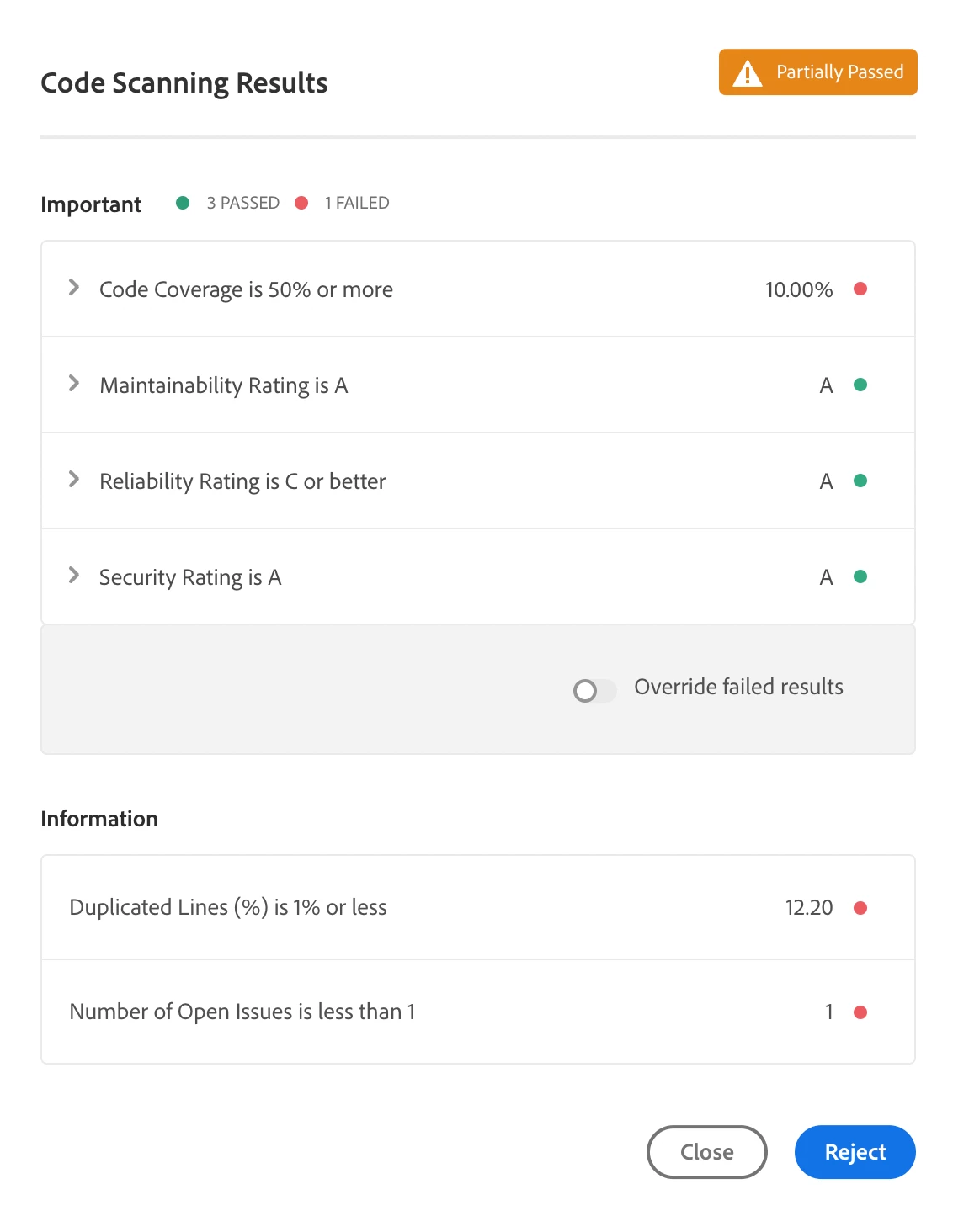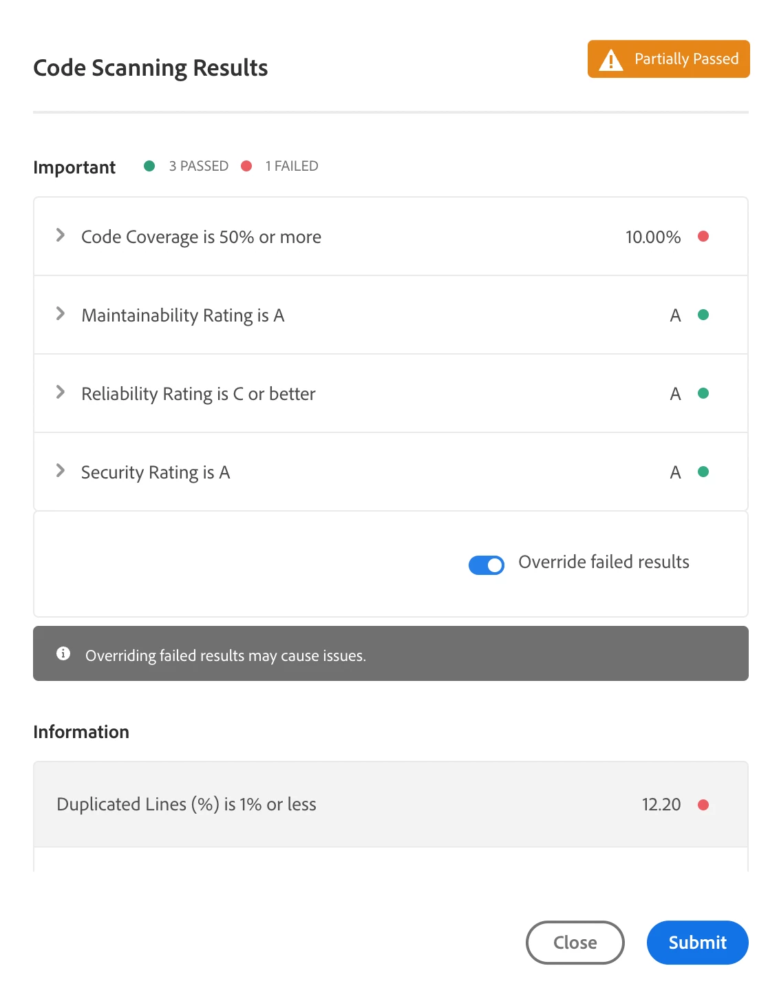 For junit, code coverage is required to be 50% for the cloud manager code quality to pass the check. But this is not mandatory which is going to fail the build. If the coverage is lower than 50%, you will get a notification and your deployment will be paused. You can still override and proceed with the deployment. You can select an option as continue immediately in the pipeline as well. Below screenshots for your reference: