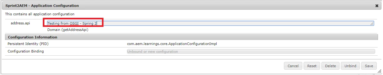 (in Pojo class, I added a getter for addressApi for testing the value entered via OSGI config)