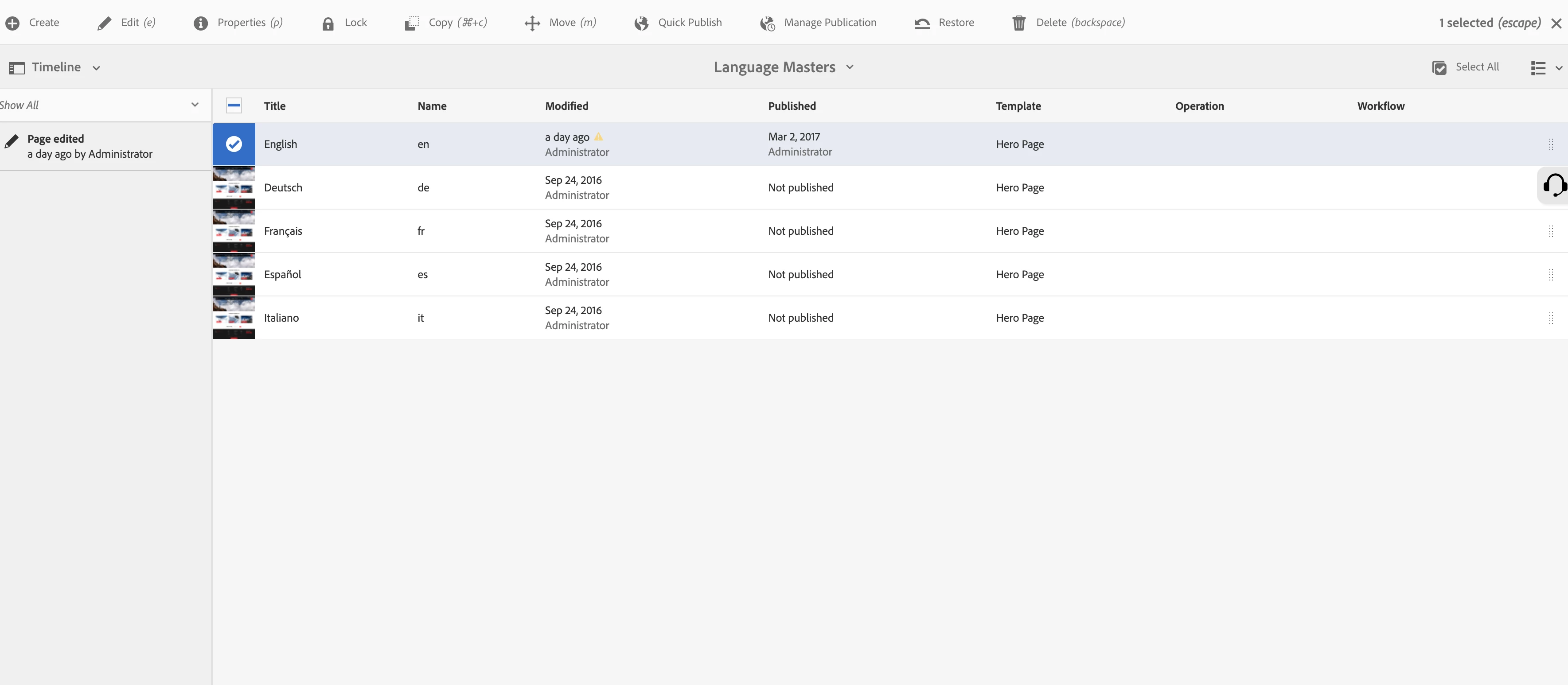 AEM 6.5.15. I can select page for Timeline using card view, but not column nor list view. Has anybody come across this issue?