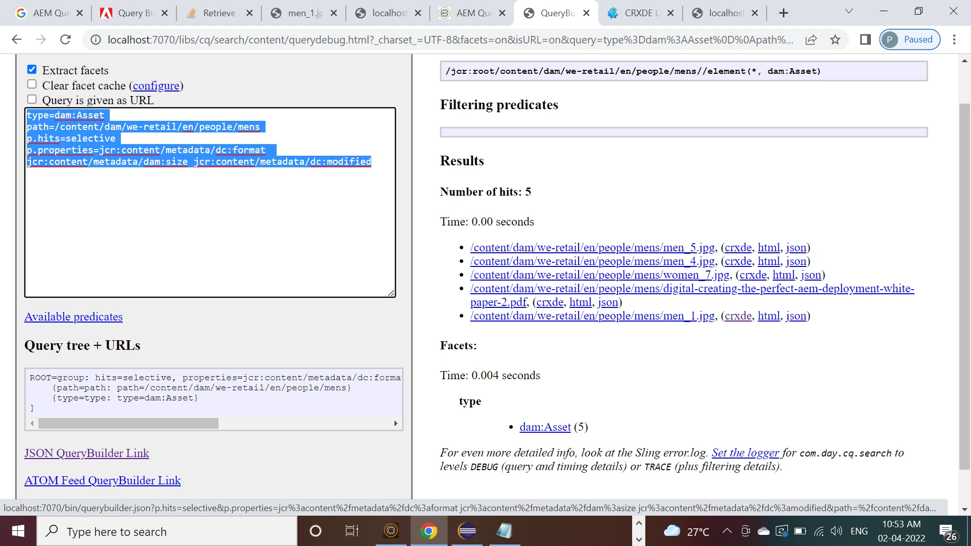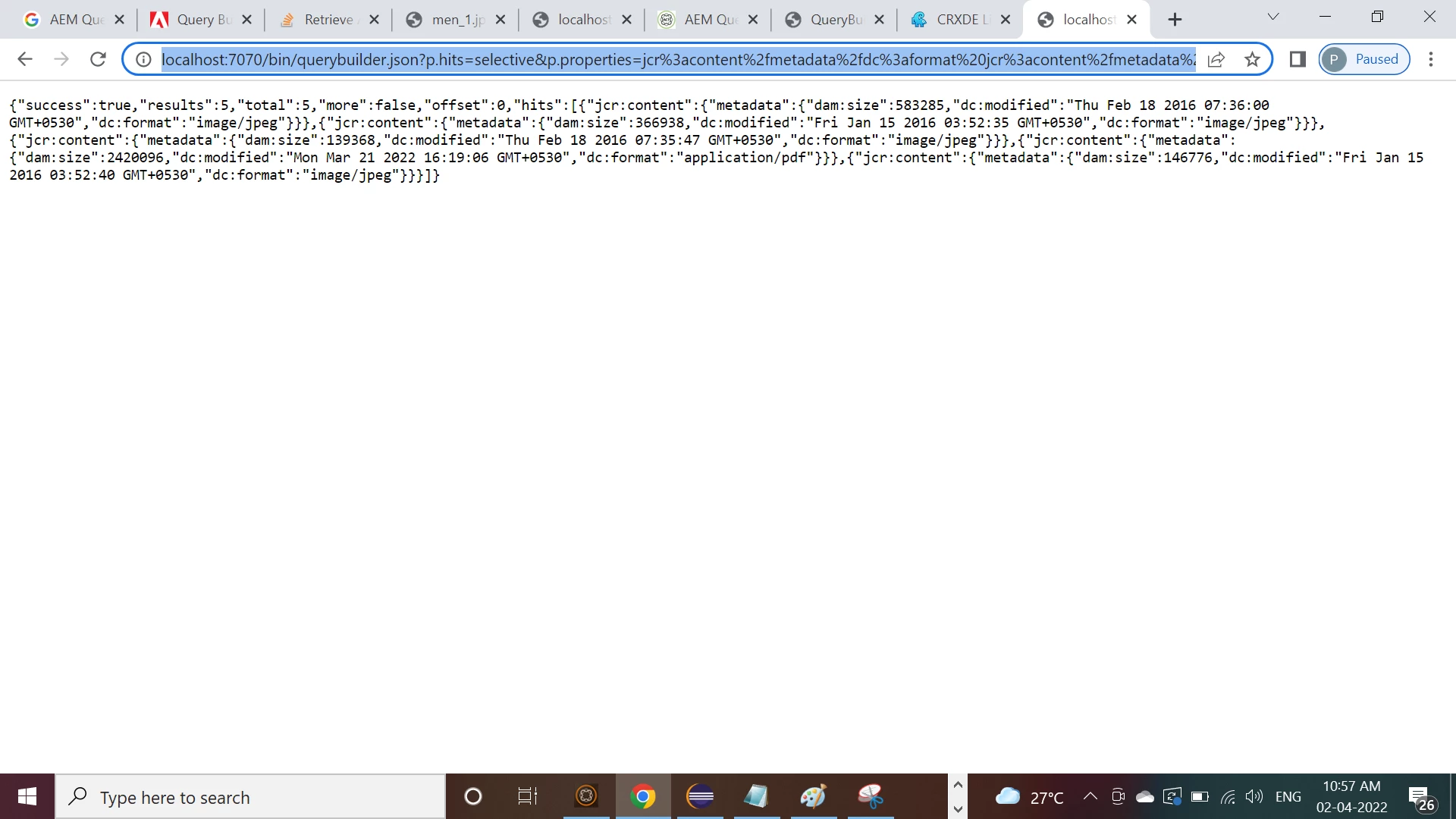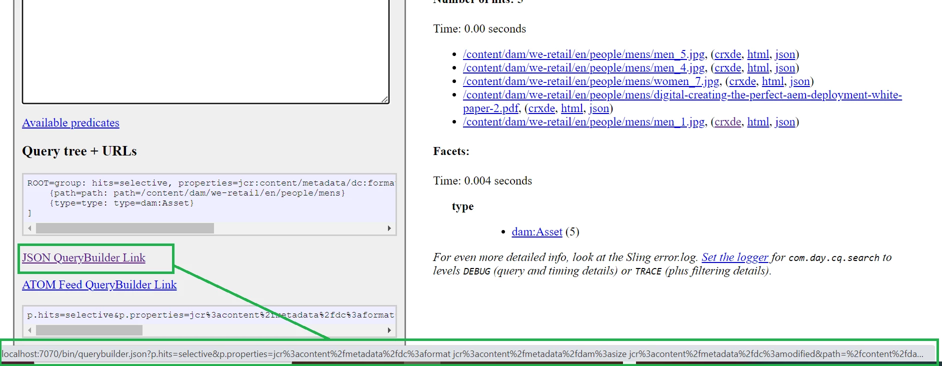 http://localhost:7070/bin/querybuilder.json?p.hits=selective&p.properties=jcr%3acontent%2fmetadata%2fdc%3aformat%20jcr%3acontent%2fmetadata%2fdam%3asize%20jcr%3acontent%2fmetadata%2fdc%3amodified&path=%2fcontent%2fdam%2fwe-retail%2fen%2fpeople%2fmens&type=dam%3aAsset