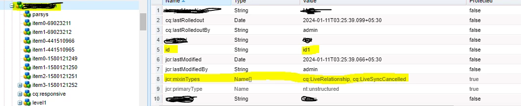 but multi-field property of the sample component cq:LiveSyncCancelled not getting applied