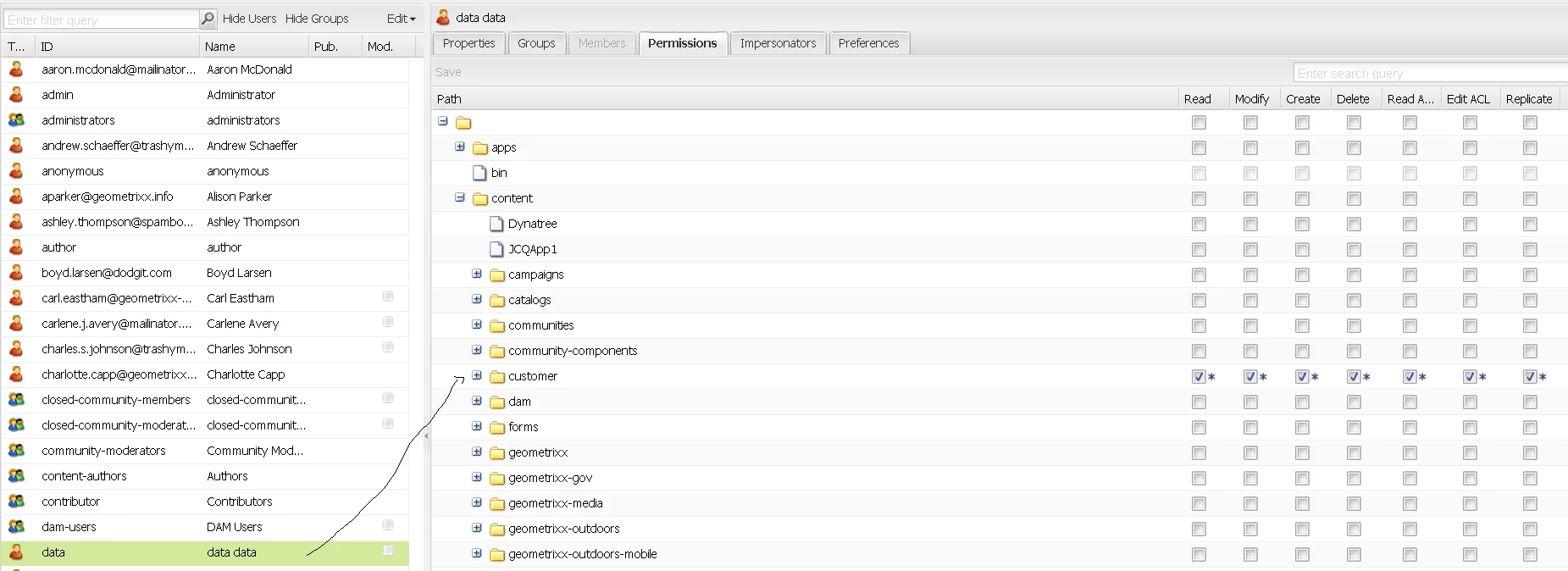 and was trying to create the user named 'data' as mentioned in the tutorial but the main issue is I am not able to give permissions as mentioned in the tutorial since the permission tab does not contain any of the data inside the repository. Attaching the images from the tutorial and my issue below.