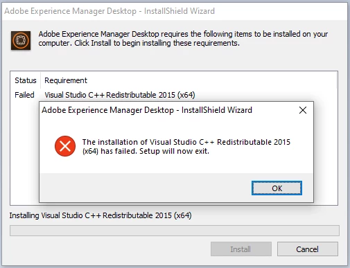 The installation of Visual Studio C++ Redistributable 2015 (x64) has failed. Setup will now exit.