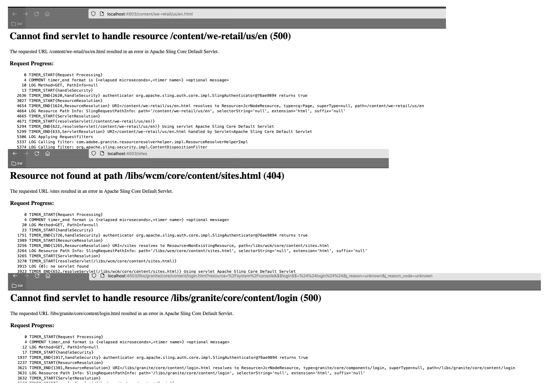 Cannot find servlet to handle resource /content/we-retail/us/en (500)