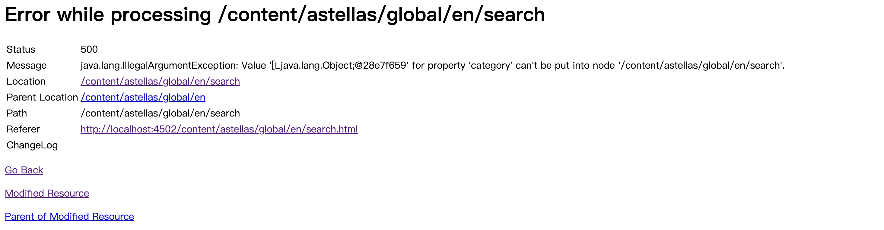 java.lang.IllegalArgumentException: Value '[Ljava.lang.Object;@ea85a90' for property 'category' can't be put into node '/content/astellas/global/en/search'. at org.apache.sling.jcr.resource.internal.JcrModifiableValueMap.put(JcrModifiableValueMap.java:76) [org.apache.sling.jcr.resource:3.2.4] at org.apache.sling.jcr.resource.internal.JcrModifiableValueMap.put(JcrModifiableValueMap.java:37) [org.apache.sling.jcr.resource:3.2.4] at org.apache.sling.servlets.post.impl.helper.SlingPropertyValueHandler.store(SlingPropertyValueHandler.java:509) [org.apache.sling.servlets.post:2.5.0] at org.apache.sling.servlets.post.impl.helper.SlingPropertyValueHandler.setPropertyAsIs(SlingPropertyValueHandler.java:257) [org.apache.sling.servlets.post:2.5.0] at org.apache.sling.servlets.post.impl.helper.SlingPropertyValueHandler.setProperty(SlingPropertyValueHandler.java:124) [org.apache.sling.servlets.post:2.5.0] at org.apache.sling.servlets.post.impl.operations.ModifyOperation.writeContent(ModifyOperation.java:372) [org.apache.sling.servlets.post:2.5.0] at org.apache.sling.servlets.post.impl.operations.ModifyOperation.doRun(ModifyOperation.java:93) [org.apache.sling.servlets.post:2.5.0] at org.apache.sling.servlets.post.impl.operations.AbstractPostOperation.run(AbstractPostOperation.java:103) [org.apache.sling.servlets.post:2.5.0] at org.apache.sling.servlets.post.impl.SlingPostServlet.doPost(SlingPostServlet.java:243) [org.apache.sling.servlets.post:2.5.0] at org.apache.sling.api.servlets.SlingAllMethodsServlet.mayService(SlingAllMethodsServlet.java:146) [org.apache.sling.api:2.27.0] at org.apache.sling.api.servlets.SlingSafeMethodsServlet.service(SlingSafeMethodsServlet.java:342) [org.apache.sling.api:2.27.0] at org.apache.sling.api.servlets.SlingSafeMethodsServlet.service(SlingSafeMethodsServlet.java:374) [org.apache.sling.api:2.27.0] at org.apache.sling.engine.impl.request.RequestData.service(RequestData.java:518) [org.apache.sling.engine:2.12.2] at org.apache.sling.engine.impl.filter.SlingComponentFilterChain.render(SlingComponentFilterChain.java:45) [org.apache.sling.engine:2.12.2] at org.apache.sling.engine.impl.filter.AbstractSlingFilterChain.doFilter(AbstractSlingFilterChain.java:88) [org.apache.sling.engine:2.12.2] at com.day.cq.wcm.core.impl.WCMDebugFilter.doFilter(WCMDebugFilter.java:138) [com.day.cq.wcm.cq-wcm-core:5.14.78] at org.apache.sling.engine.impl.filter.AbstractSlingFilterChain.doFilter(AbstractSlingFilterChain.java:78) [org.apache.sling.engine:2.12.2] at com.adobe.cq.dam.cfm.ui.impl.EditorCacheFilter.doFilter(EditorCacheFilter.java:102) [com.adobe.dam.cq-dam-cfm-impl:0.12.296] at org.apache.sling.engine.impl.filter.AbstractSlingFilterChain.doFilter(AbstractSlingFilterChain.java:78) [org.apache.sling.engine:2.12.2] at com.adobe.granite.metrics.knownerrors.impl.ErrorLoggingComponentFilter.doFilter(ErrorLoggingComponentFilter.java:71) [com.adobe.granite.metrics.knownerrors:0.0.24] at org.apache.sling.engine.impl.filter.AbstractSlingFilterChain.doFilter(AbstractSlingFilterChain.java:78) [org.apache.sling.engine:2.12.2] at org.apache.sling.engine.impl.filter.AbstractSlingFilterChain.doFilter(AbstractSlingFilterChain.java:84) [org.apache.sling.engine:2.12.2] at com.day.cq.wcm.core.impl.WCMComponentFilter.filterRootInclude(WCMComponentFilter.java:375) [com.day.cq.wcm.cq-wcm-core:5.14.78] at com.day.cq.wcm.core.impl.WCMComponentFilter.doFilter(WCMComponentFilter.java:190) [com.day.cq.wcm.cq-wcm-core:5.14.78] at org.apache.sling.engine.impl.filter.AbstractSlingFilterChain.doFilter(AbstractSlingFilterChain.java:78) [org.apache.sling.engine:2.12.2] at com.day.cq.wcm.core.impl.page.PageLockFilter.doFilter(PageLockFilter.java:91) [com.day.cq.wcm.cq-wcm-core:5.14.78] at org.apache.sling.engine.impl.filter.AbstractSlingFilterChain.doFilter(AbstractSlingFilterChain.java:78) [org.apache.sling.engine:2.12.2] at com.day.cq.personalization.impl.TargetComponentFilter.doFilter(TargetComponentFilter.java:94) [com.day.cq.cq-personalization:5.13.50] at org.apache.sling.engine.impl.filter.AbstractSlingFilterChain.doFilter(AbstractSlingFilterChain.java:78) [org.apache.sling.engine:2.12.2] at org.apache.sling.engine.impl.SlingRequestProcessorImpl.processComponent(SlingRequestProcessorImpl.java:334) [org.apache.sling.engine:2.12.2] at org.apache.sling.engine.impl.filter.RequestSlingFilterChain.render(RequestSlingFilterChain.java:49) [org.apache.sling.engine:2.12.2] at org.apache.sling.engine.impl.filter.AbstractSlingFilterChain.doFilter(AbstractSlingFilterChain.java:88) [org.apache.sling.engine:2.12.2] at com.day.cq.dam.core.impl.assetlinkshare.AdhocAssetShareAuthHandler.doFilter(AdhocAssetShareAuthHandler.java:516) [com.day.cq.dam.cq-dam-core:5.13.498] at org.apache.sling.engine.impl.filter.AbstractSlingFilterChain.doFilter(AbstractSlingFilterChain.java:78) [org.apache.sling.engine:2.12.2] at org.apache.sling.engine.impl.filter.AbstractSlingFilterChain.doFilter(AbstractSlingFilterChain.java:84) [org.apache.sling.engine:2.12.2] at org.apache.sling.engine.impl.filter.AbstractSlingFilterChain.doFilter(AbstractSlingFilterChain.java:84) [org.apache.sling.engine:2.12.2] at com.day.cq.wcm.core.impl.warp.TimeWarpFilter.doFilter(TimeWarpFilter.java:109) [com.day.cq.wcm.cq-wcm-core:5.14.78] at org.apache.sling.engine.impl.filter.AbstractSlingFilterChain.doFilter(AbstractSlingFilterChain.java:78) [org.apache.sling.engine:2.12.2] at org.apache.sling.engine.impl.filter.AbstractSlingFilterChain.doFilter(AbstractSlingFilterChain.java:84) [org.apache.sling.engine:2.12.2] at com.day.cq.dam.core.impl.servlet.ActivityRecordHandler.doFilter(ActivityRecordHandler.java:141) [com.day.cq.dam.cq-dam-core:5.13.498] at org.apache.sling.engine.impl.filter.AbstractSlingFilterChain.doFilter(AbstractSlingFilterChain.java:78) [org.apache.sling.engine:2.12.2] at com.adobe.granite.rest.impl.servlet.ApiResourceFilter.doFilter(ApiResourceFilter.java:70) [com.adobe.granite.rest.api:1.1.40] at org.apache.sling.engine.impl.filter.AbstractSlingFilterC