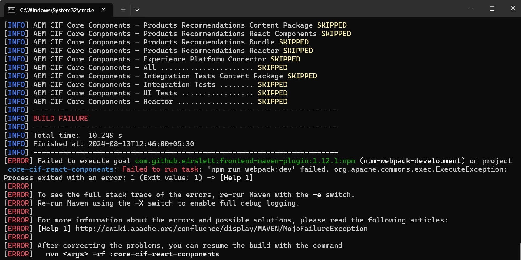 I have downloaded this CIF core project. Tried to run the command: mvn clean install -DskipTests its failing