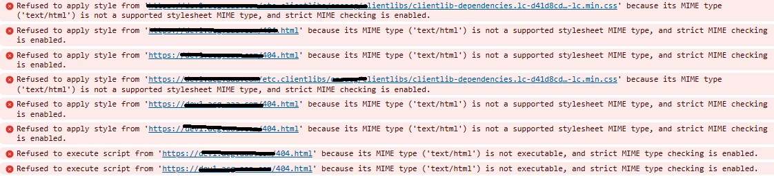 Refused to apply style from 'https://domainname/etc.clientlibs/projectname/clientlibs/clientlib-dependencies.lc-d41d8cd98f00b204e9800998ecf8427e-lc.min.css' because its MIME type ('text/html') is not a supported stylesheet MIME type, and strict MIME checking is enabled."