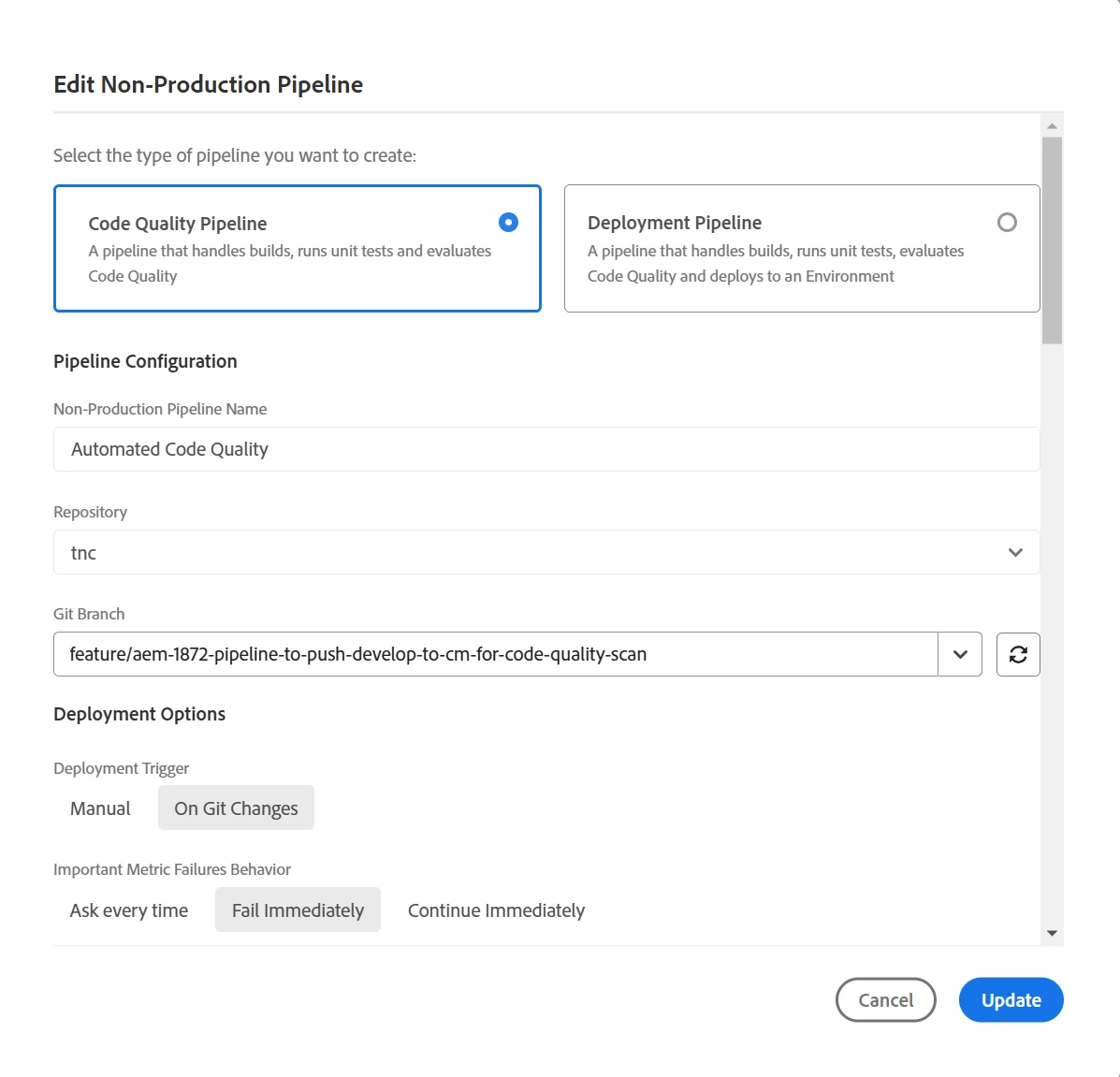 In Adobe Cloud Manager we have the ability to create Code Quality Pipelines that can be configured to automatically trigger when new commits are pushed to the specified branch. I have configured such a pipeline as seen below.