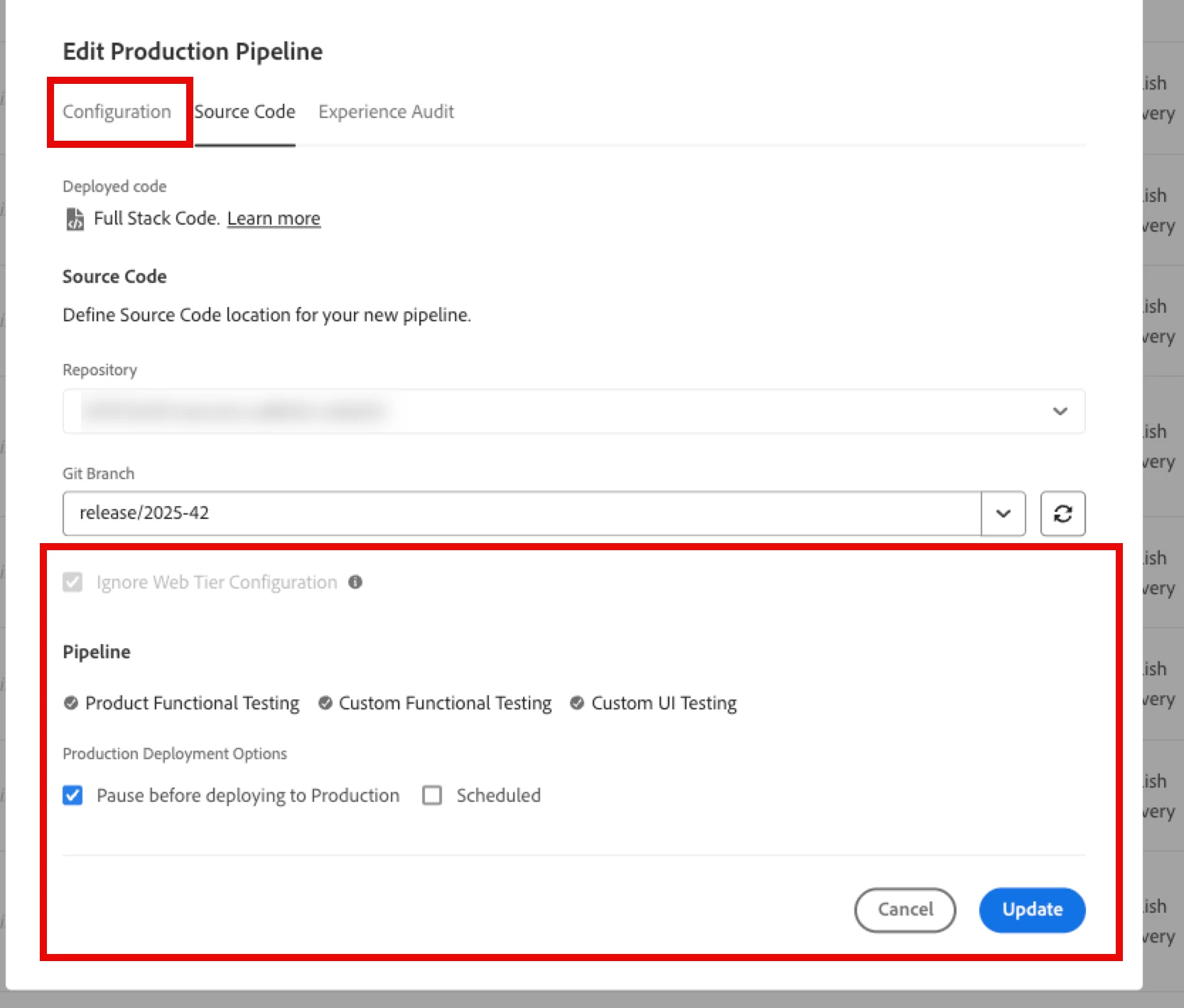 Cloud Manager: Move Pipeline Configuration from "Source" to "Configuration" tab. |