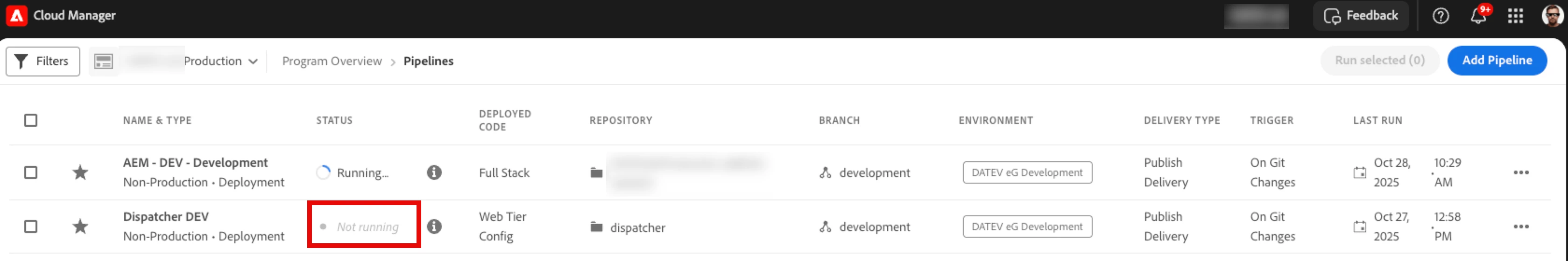| Current/Experienced Behavior: | In CloudManage, when the last pipeline execution failed, the status is "Running". |