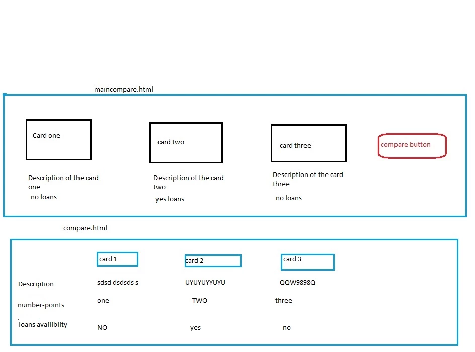 I have one compare functionality on my page, once user will select the card from main page(maincompare.html), it will open a pop up window with all selected card and once user will click on compare button it will redirect all the selected card value on new page( compare.html).After click on compare button I am able to redirect on next page( compare.html) but not able to fetch the values on next page.Please suggest how can i pass the selected values from maincompare.page(compare.html) to compare.html page.Please check the diagram.