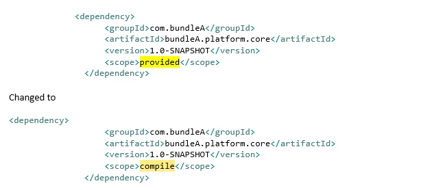 Interface A is in Bundle A. Abstract Class B implements A in Bundle B. Added A dependency in B pom.xml. Now Class C in Bundle C extends Class B from bundle B. Hence added bundle B dependency in Bundle C pom.xml as shown in the attached image. But the issue is I still getting compilation issue in Bundle C saying it is not able to resolve Interface A which is in Bundle A.