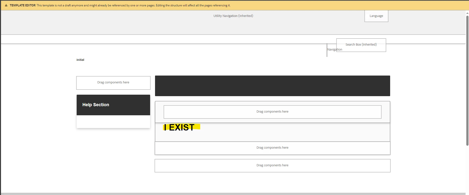 However, when a page is created with that template, "I EXIST" does not display. I even debugged my local instance and the component init function never gets called like it does on the template editor page.