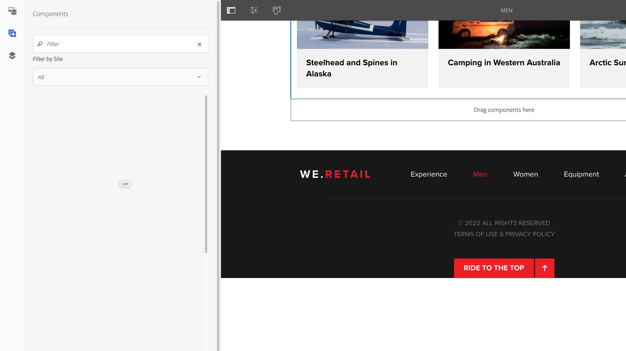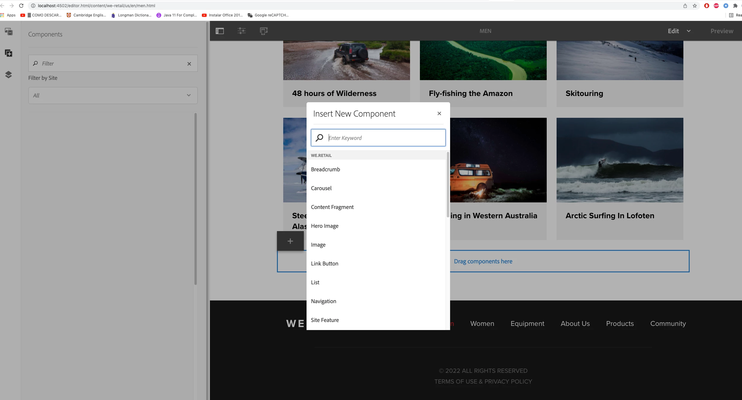 I just installed AEM 6.5 on my MacBook Pro for testing purposes and to play around with this app. The first time I installed from scratch (6.5.0), everything was working fine but when I updated it to SP11 the component list disappeared. I didn't touch anything at config level etc.. it just happened when upgrading. Somehow the components are there but it's not showing up, instead, they are kind of greyed out.