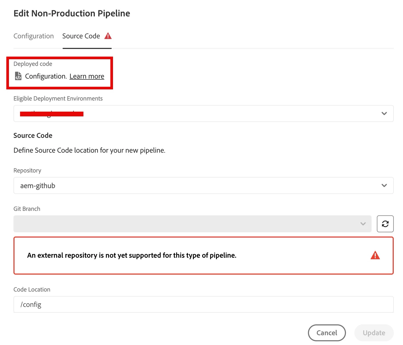 Currently we are not able to configure external github repositories to a Configuration deployment pipelines. When we add non-adobe github repo, it throws error `An external repository is not yet supported for this type of pipeline.` |