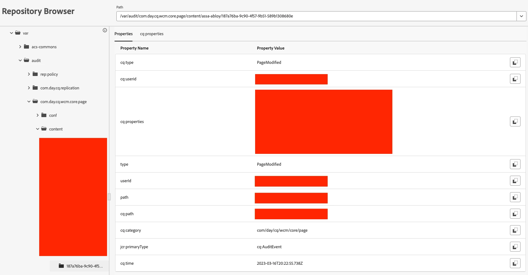 Instead, audit events are stored in the repository under the path /var/audit. AEM Devs can use the Repository Browser to inspect audit events.