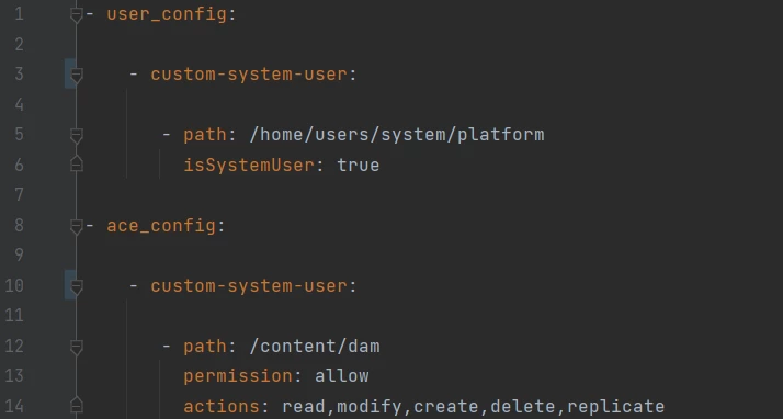 The permissions for the system user (ACE and User) are picked from yml file defined as below -
