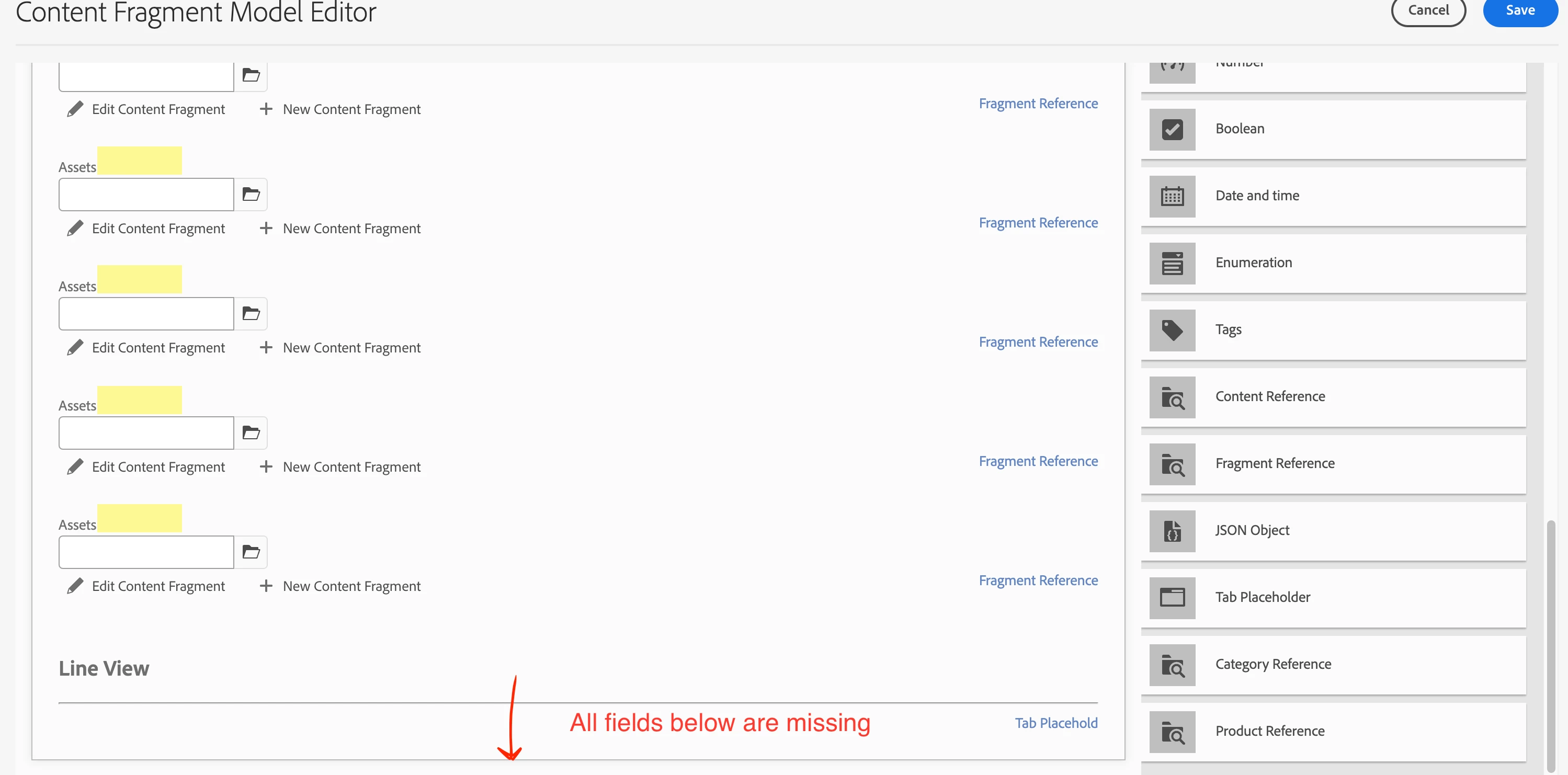 I have a content fragment model that has 50 - 60 fields in it. After adding some more fields and saved, I opened the model editor and most of the fields have disappeared. I added yet another field and saved again, it became totally empty.