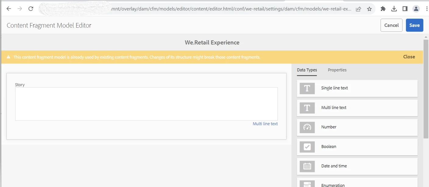 OOTB working copy: /mnt/overlay/dam/cfm/models/editor/content/editor.html/conf/we-retail/settings/dam/cfm/models/we-retail-experience