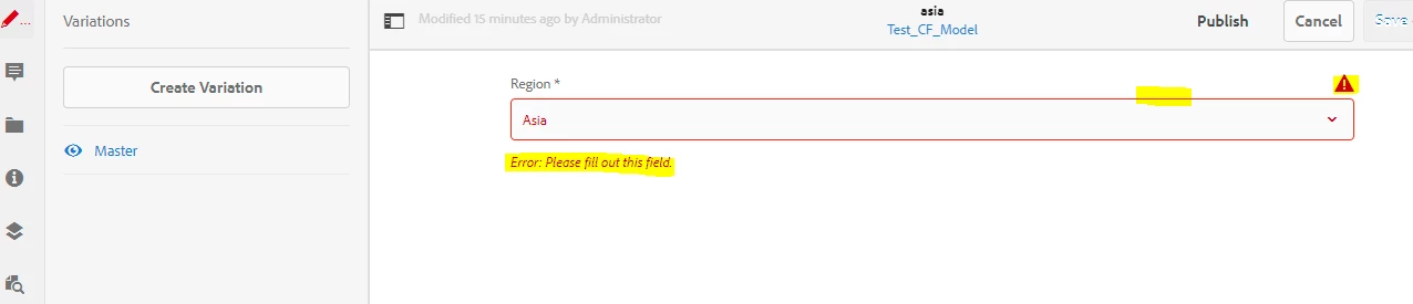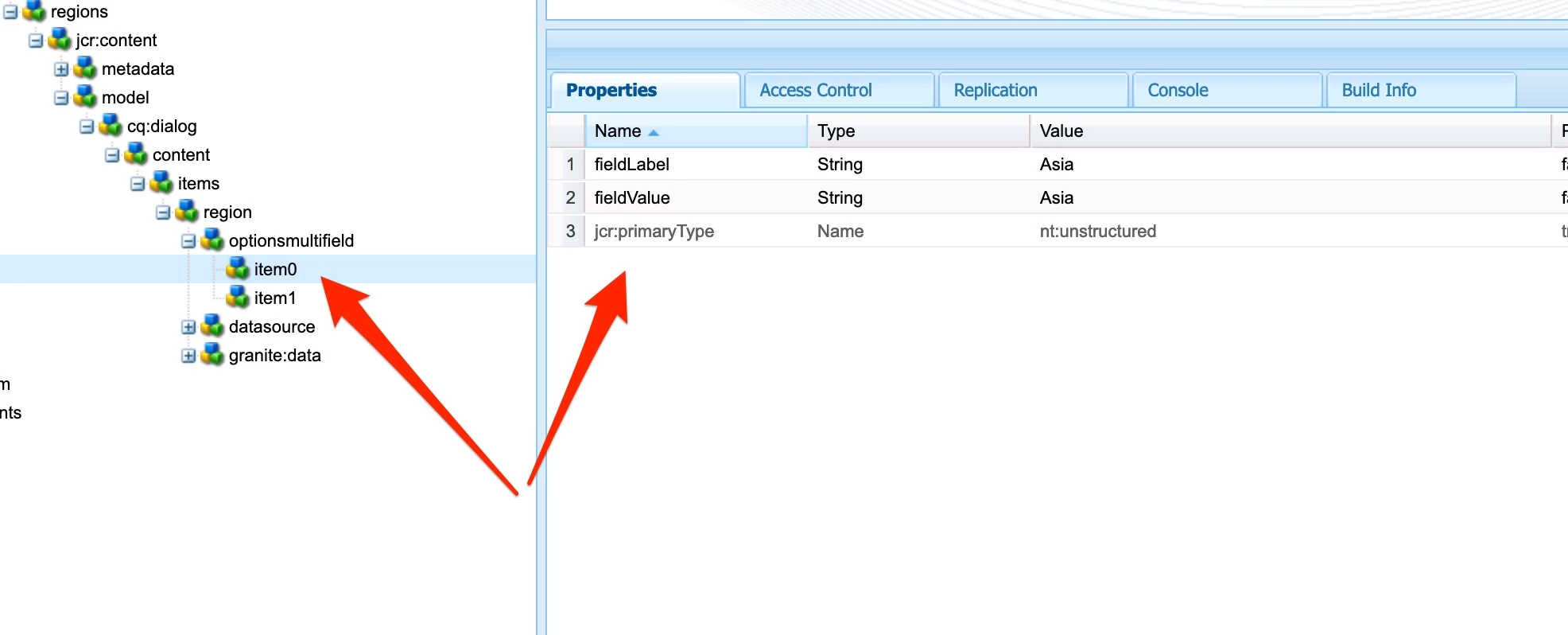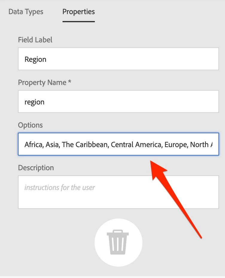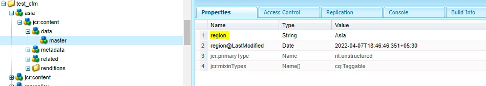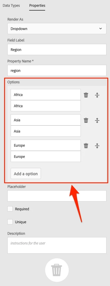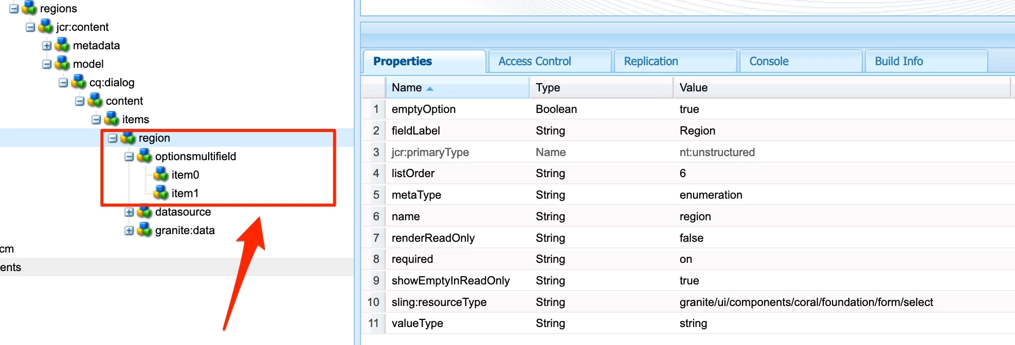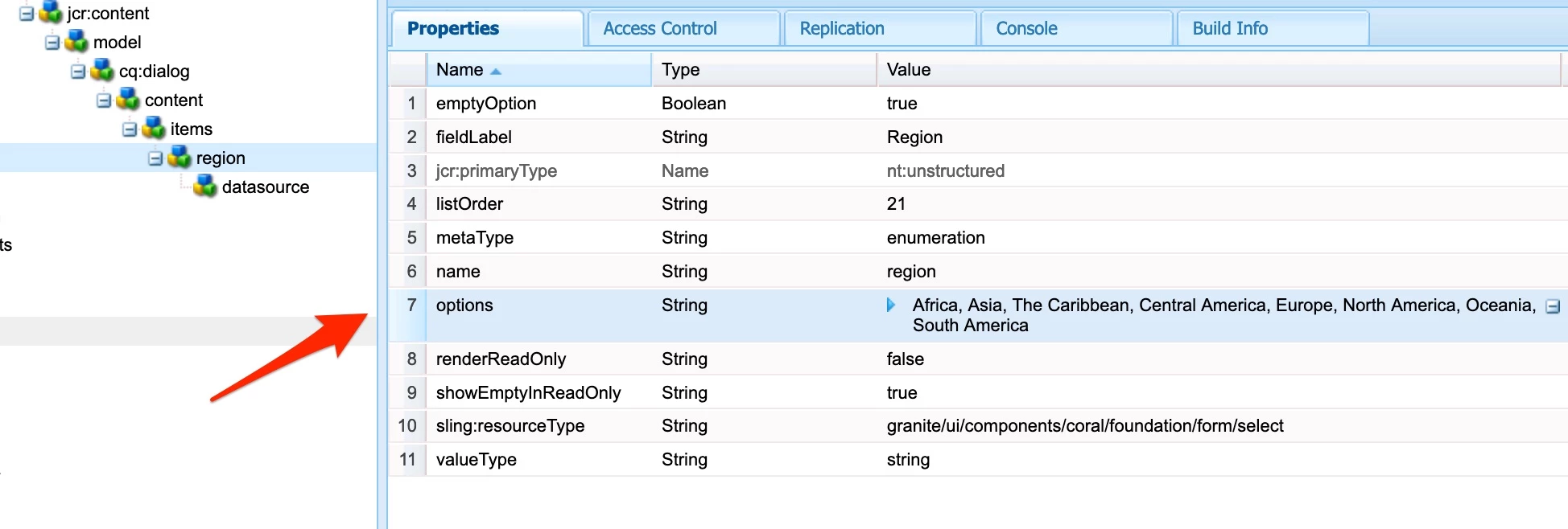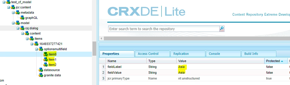 - Create optionsmultifield under region node that is part of content fragment model.