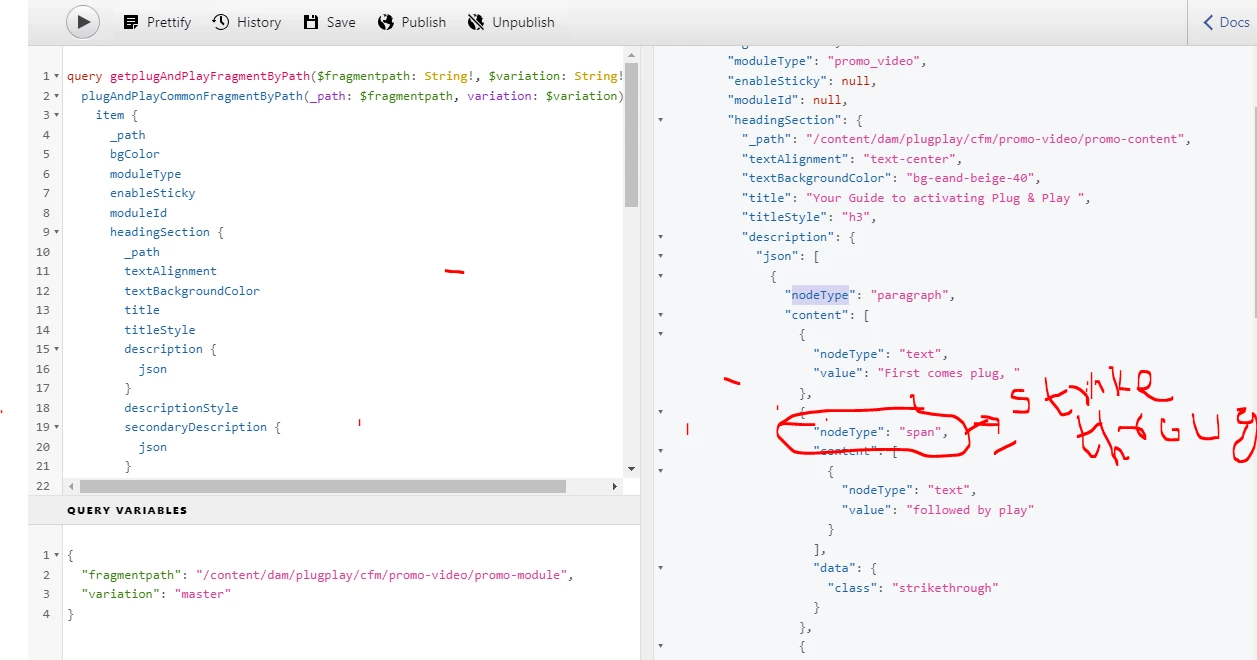 We are in AEMasCS, we implemented strikethrough plugin in our contentfragment RTE model, while explore the graphql json data, we are getting the "nodeType" as "span" instead of nodeType as "strikethrough", kindly let us know is there any option to change the "nodeType" as "strikethrough", pfb our graphql json data.