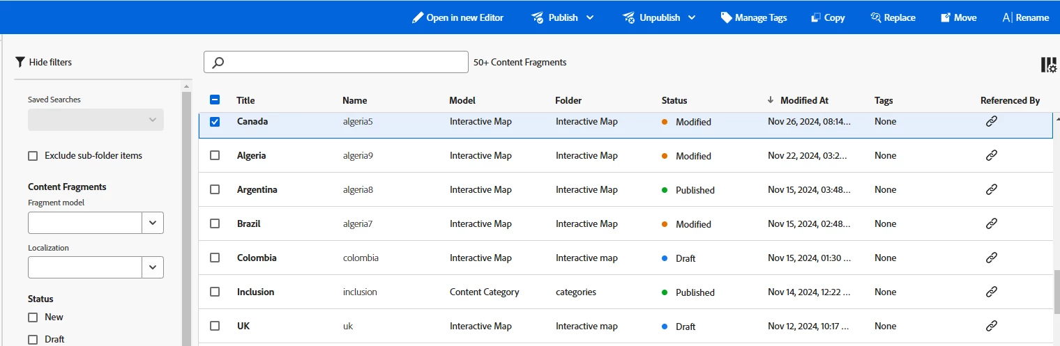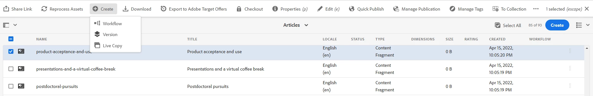 | Use-case: | This is a common scenario where content editors do not have permission to use quick publish/publish management, but are forced to use activation workflows to ensure only approved content is published. A new content fragments console does not have an option to start a workflow. |