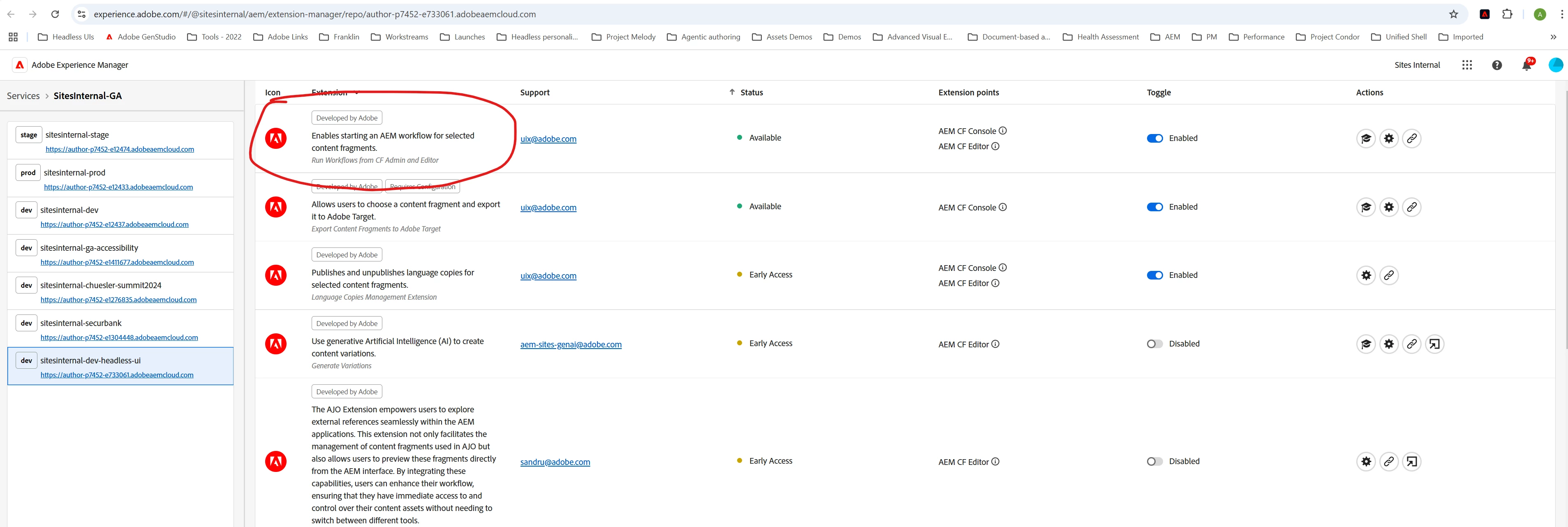 Content fragments console: start a workflow for CF