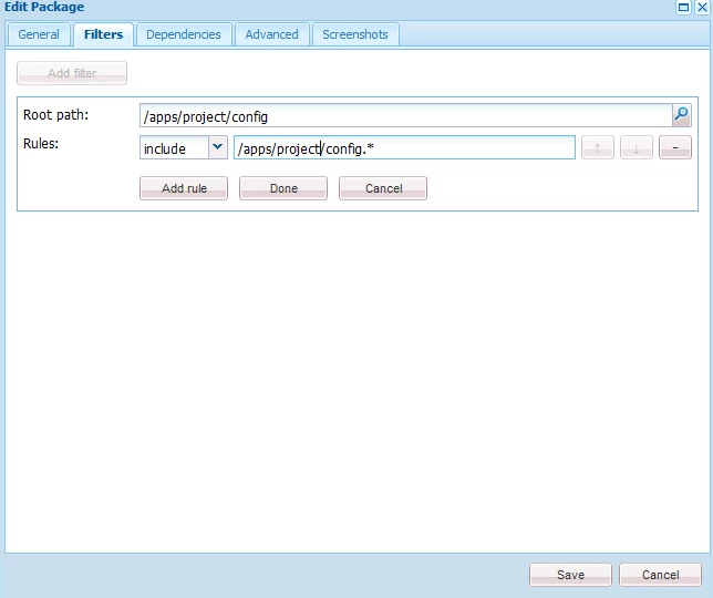 I want to take build using package manager that all the config folder under /apps/<myproject>/ folders. In each environment I will not know what type of runmode folders there. Is there a way to use filter to select all the folder starts with config instead of adding all the entry in filter node as below.