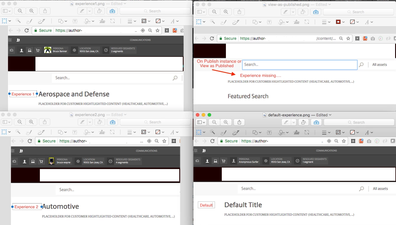 I've done as specified in https://docs.adobe.com/docs/en/aem/6-2/author/personalization/content-targeting-touch.html and i'm abel to see the experiences in Author mode, but when i'm using "View as Published" or on Publish instance (after Publishing the page), the targeted components do not show up. Not even the default. WE have a Dispatcher, also checked the permissions to allow personalization ( /libs/cq/personalization ) are set.