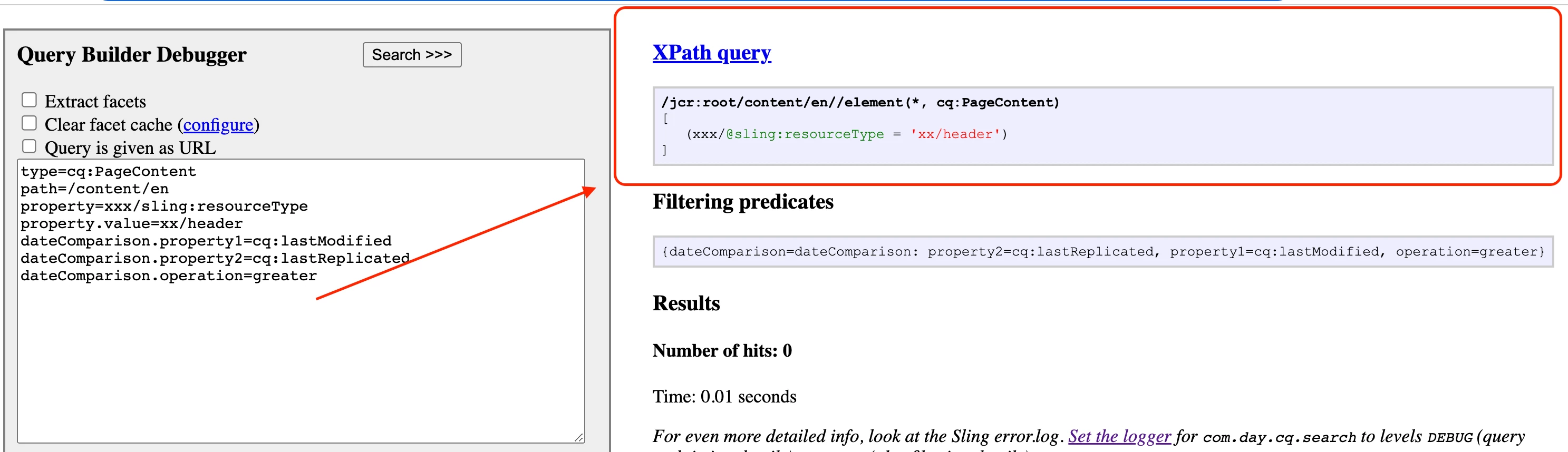 13.12.2022 09:51:13.715 *DEBUG* [[0:0:0:0:0:0:0:1] [1670905273708] GET /libs/cq/search/content/querydebug.html HTTP/1.1] org.apache.jackrabbit.oak.query.QueryImpl query execute select [jcr:path], [jcr:score], * from [cq:PageContent] as a where [xxx/sling:resourceType] = 'xx/header' and isdescendantnode(a, '/content/en') /* xpath: /jcr:root/content/en//element(*, cq:PageContent)[(xxx/@sling:resourceType = 'xx/header')] */
