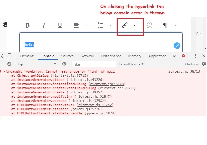 - On opening the dailogbox in touch UI the field is converted to rich text, but i am not able to hyperlink. The field is not clickable. There is an error in console.Have attached the screenshot(<img_1>)