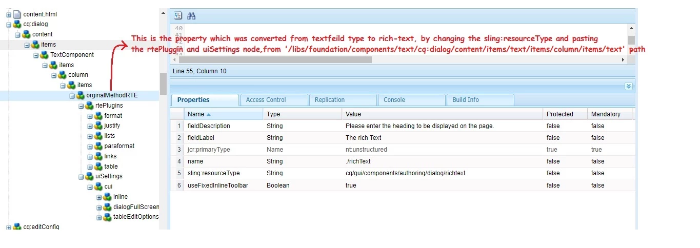 - Copy the folders under the '/libs/foundation/components/text/cq:dialog/content/items/text/items/column/items/text' path . ie, 'rtePlugins' and 'uiSettings' , and the paste the nodes to the above to be converted text node.(img_2)