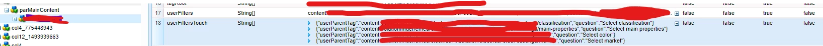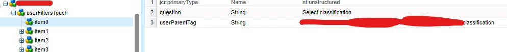 So to overcome this we have written a servlet which converted all previous node properties "userFiltersTouch" to nodes item like: