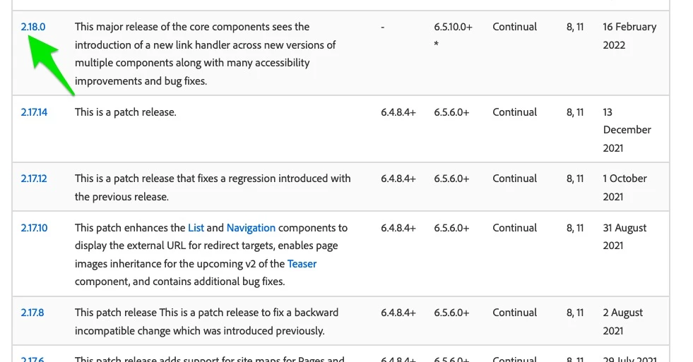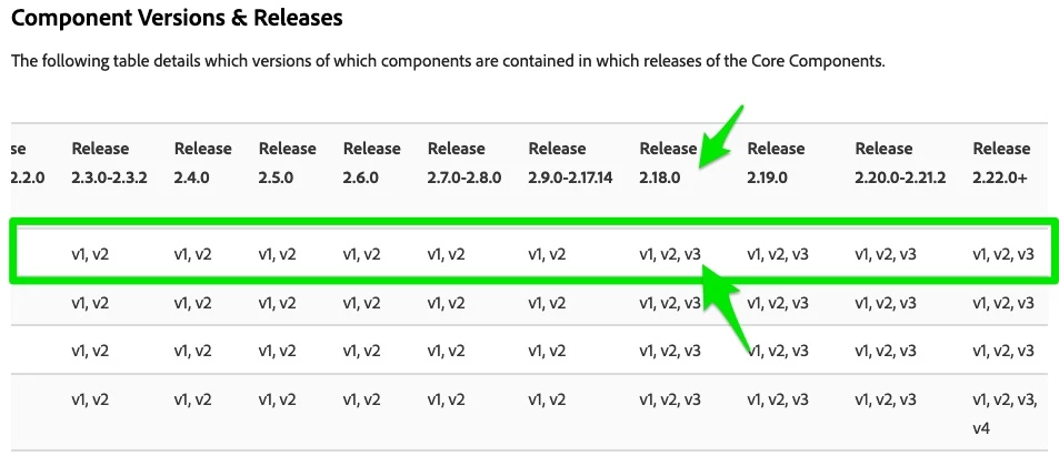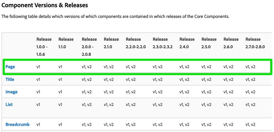 I'm trying to find if there's a table/summary of differences with the different versions of core components (page, breadcrumbs and etc). BUT I am not having any luck finding such information.